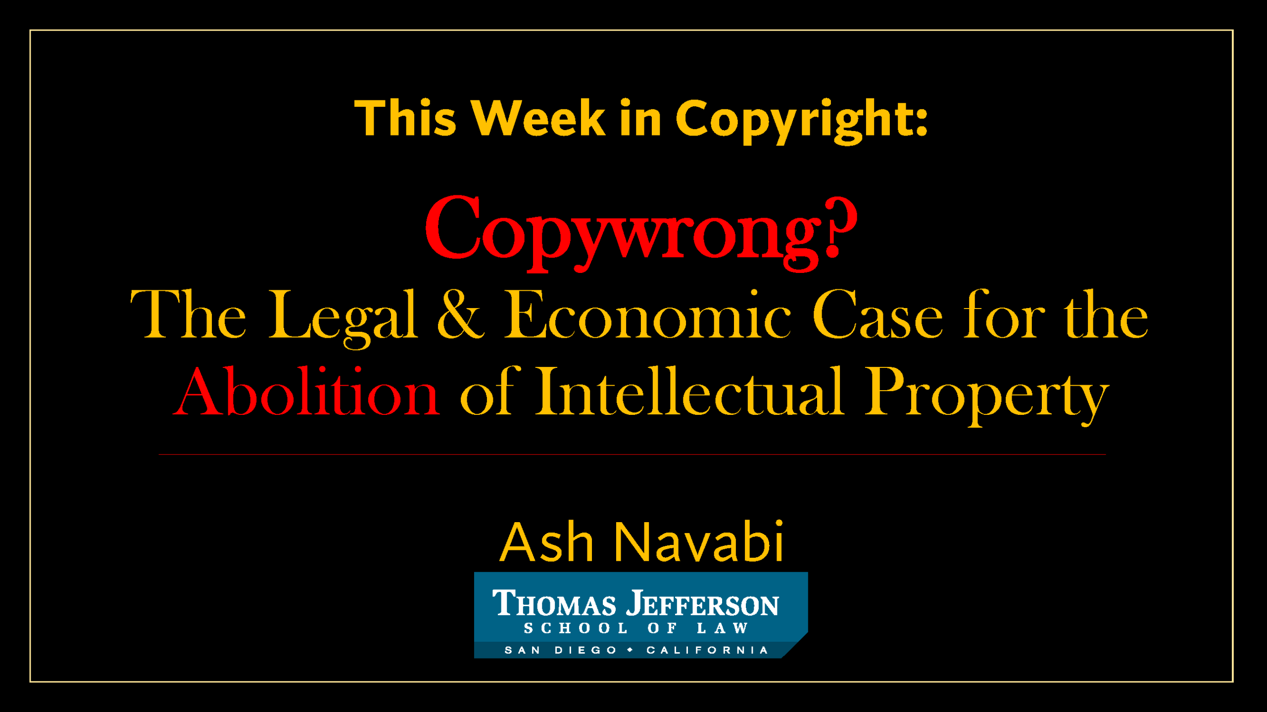 Ash Navabi, former GMU econ grad student (see previous podcast discussion with him),1 now a law student at Thomas Jefferson School of Law, sent me this presentation he gave in his copyright class: “This Week in Copyright: Copywrong? The Legal & Economic Case for the Abolition of Intellectual Property” (pptx; pdf). Heroic!